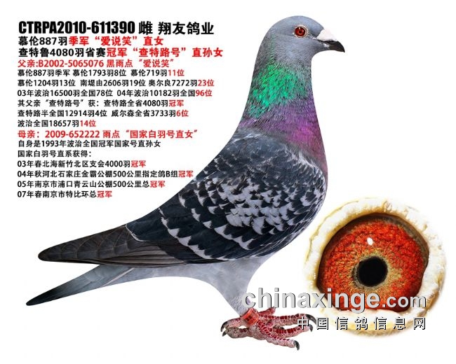 图一 2013年巴塞罗那大赛波兰全国冠军鸽,这羽冠军鸽飞了8天才归巢,飞行空距1484公里。