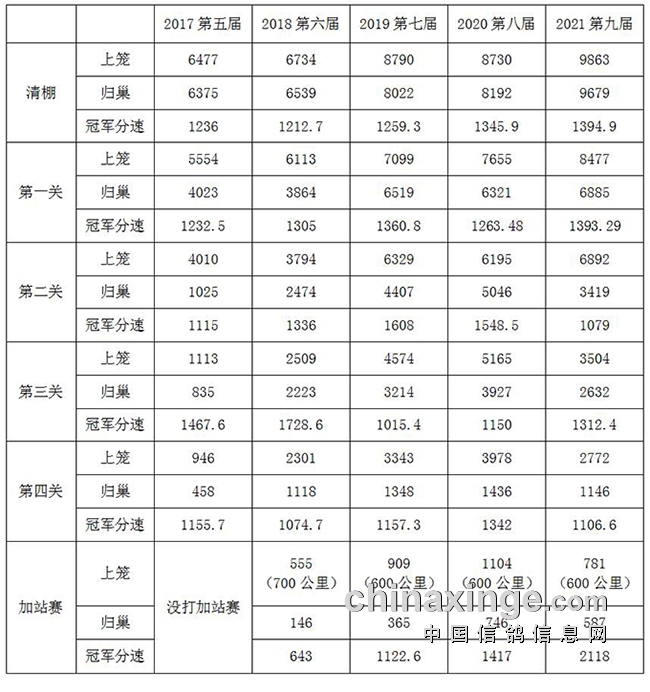 从2017年到2020年,公棚迎来稳定提升期,参赛费稳定于2300元/羽,每年的会员人数和收鸽羽数稳步增长:2017年会员人数914人,收鸽7818羽;2018元会员人数1143人,收鸽9363羽;2019年会员1327人,收鸽10463羽;2020年会员1680人,收鸽11313羽。2021年,帝珲将参赛费提高到2800元,会员人数为2340人,同时收鸽数也突破历史新高12700羽。有据可查,这五年帝珲都打满了四关比赛,并且2018年到2021年还打了加站赛,单关表现也很精彩,偶有某一关归巢率较低,也是在极为恶劣天气下(从分速可以看出),帝珲养功在西北赛线的艰难考验下经受住了重重考验。