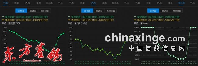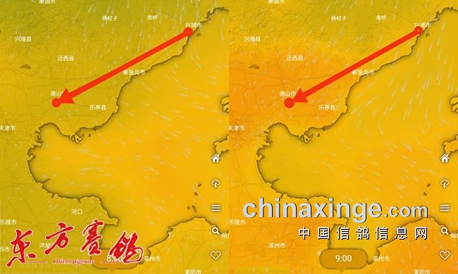 今日沿途赛线没有特殊不利天气,小鸽子们可以自由地享受着天蓝风轻的大自然风光,从司放地辽宁葫芦岛市曹庄镇四城子村到河北省秦皇岛市青龙满族自治县这一段一直是东北风;从河北省秦皇岛市青龙满族自治县到归巢地河北省唐山市丰南区这一段,在6点39分到9点之间是西北风,在9点以后转为东北风。根据冠军鸽的分速和报到时间(见下文)分析,鸽群第一梯队到达青龙满族自治县是在9点左右,恰好赶上刚刚变向的东北风。所以总体来看,赛鸽从起飞到归巢都有东北风的侧顺风一路呵护。但今日整条赛线风力都在1.5米/秒~4.7米/秒之间,微弱的风力对赛鸽归巢助力十分有限。
