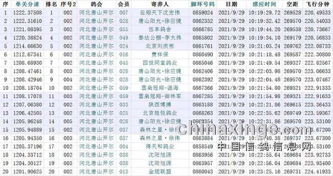 28号棚唐山阳光+徐应捷麾下0862332于10:19:32.42第二个报到,以1222.31米/分获得亚军;