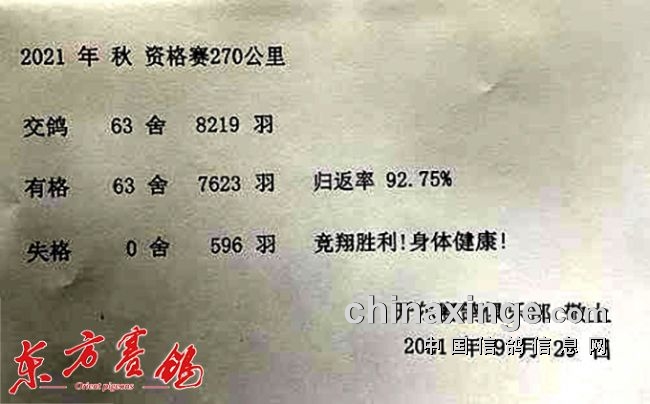 9月29日比赛的单位有近百家之多,数十万羽赛鸽在祖国大地上同日竞翔的盛况让鸽友们应接不暇,唐山开尔赛鸽俱乐部2021年“开尔杯”职业鸽舍公开赛资格赛,今日在辽宁省葫芦岛市放飞8219羽,当日归巢7623羽,归巢率92.75%。