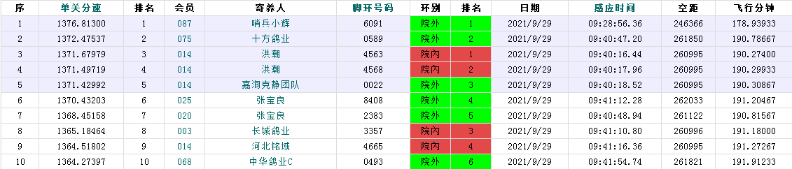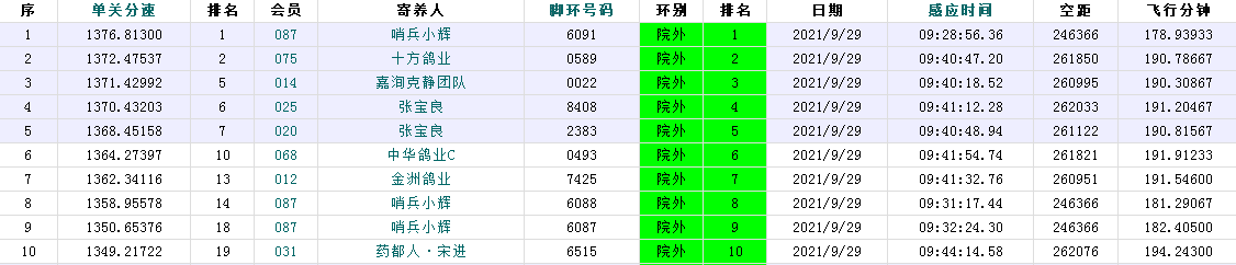 第3羽报到的来自院外087团队的哨兵小辉麾下6091号赛鸽于09:28:56.36入棚,以1376.81米/分荣获冠军;