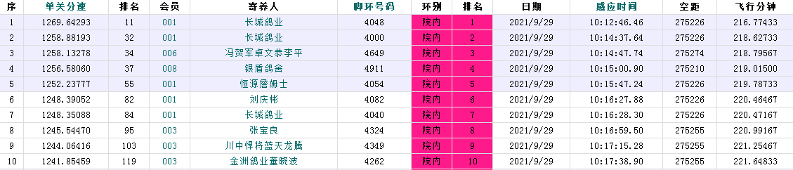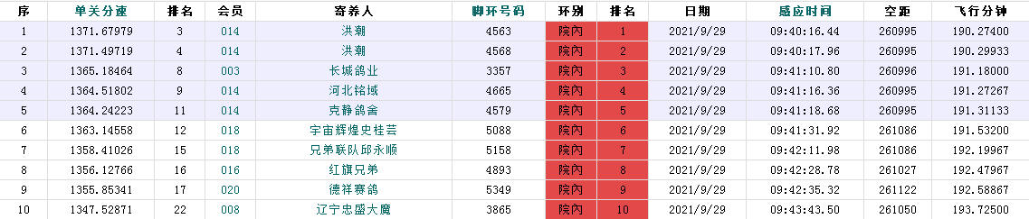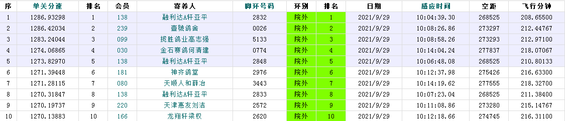 第1羽报到的来自院外138团队的融利达A轩亚平麾下2832号赛鸽,于10:04:39进棚,以1286.93米/分荣获冠军;