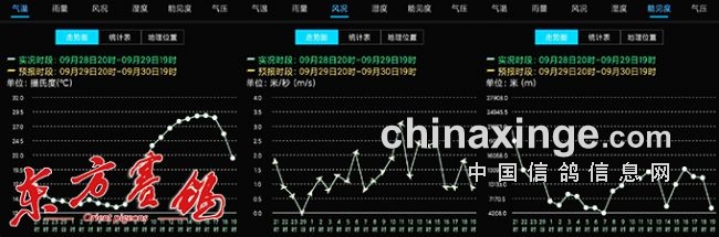 虽然东部赛区和西部赛区的司放地与归巢地都不相同,但两条赛线都位于华北平原内,全程地势平坦,没有较大的山脉需要攀越,在秋季气候较稳定,没有极端天气阻碍赛鸽归巢。气温上来看,今日国内虽有高温,但都被长江隔绝在长江以南,赛线温度在16℃~28℃之间不影响赛鸽飞行。风况上来看令人惊讶,今日两条赛线整体风向都是1~3级东北风,对于向着东北方向归巢的赛鸽来说是正面直吹的顶风,但开创者东部赛区和西部赛区的健儿们竟然分别飞出了1376.81300米/分和1286.93298米/分的分速,不禁让人为开创者俱乐部各团队教练的掌教水平暗暗称赞。