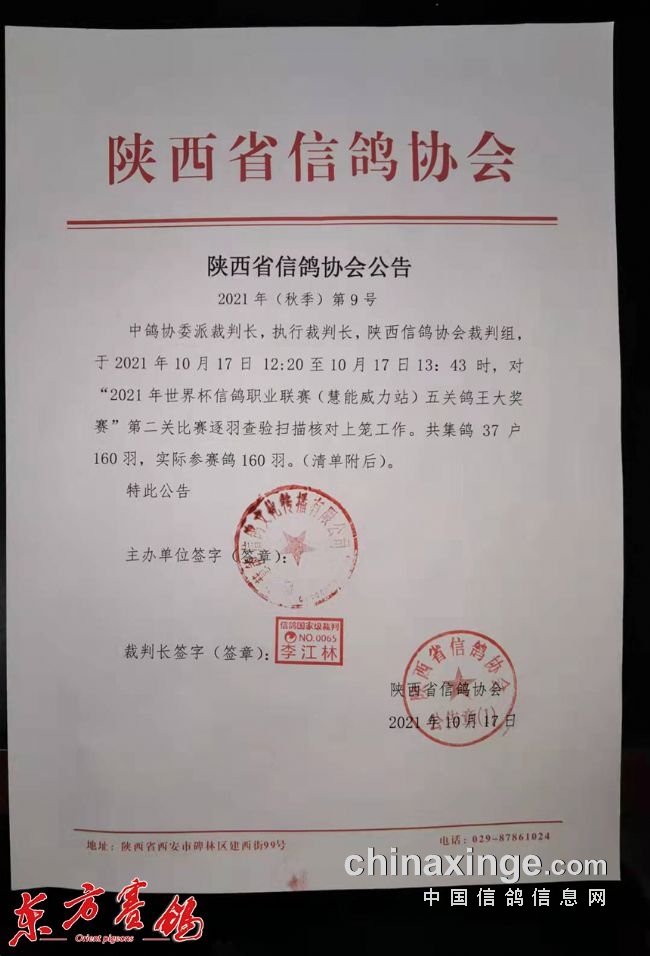 12时20分起至13时43分结束,用时1小时23分,37个团队参赛鸽160羽。其中,院内9大团队集鸽30羽,院外28个团队集鸽130羽,中鸽协选派了甘肃省信鸽协会国家级裁判李江林为裁判长,陕西省信鸽协会裁判委员会主任曹树镇和裁判员到场共同执裁,鸽子少,仍然一丝不苟地按制度执行。