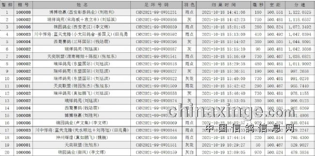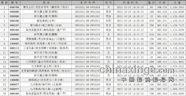 亚军是院外8号团队新天鹰公棚(杜腾腾) 的 CHN2021-99-0W01828 雨点 2021-10-18 14:36:53入棚,分速 1,135.6096,荣获亚军。