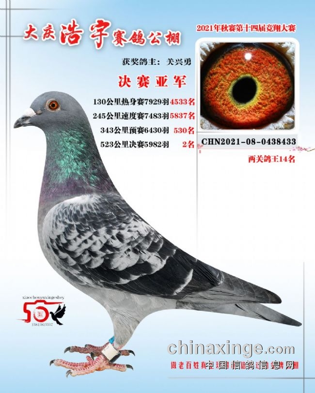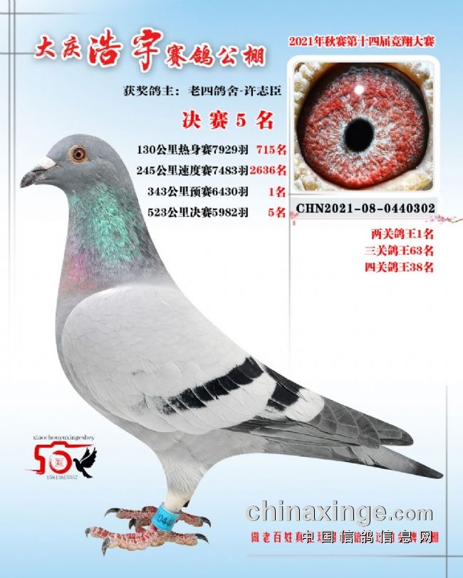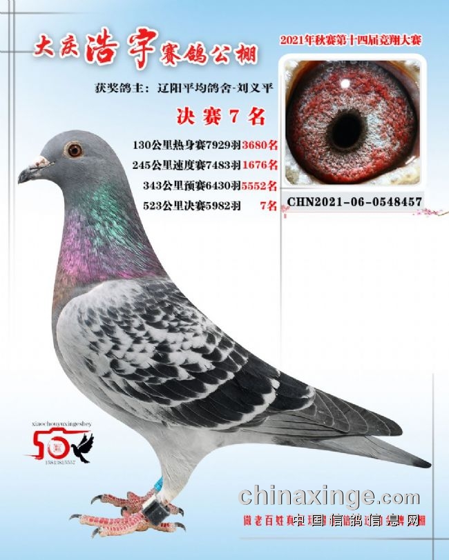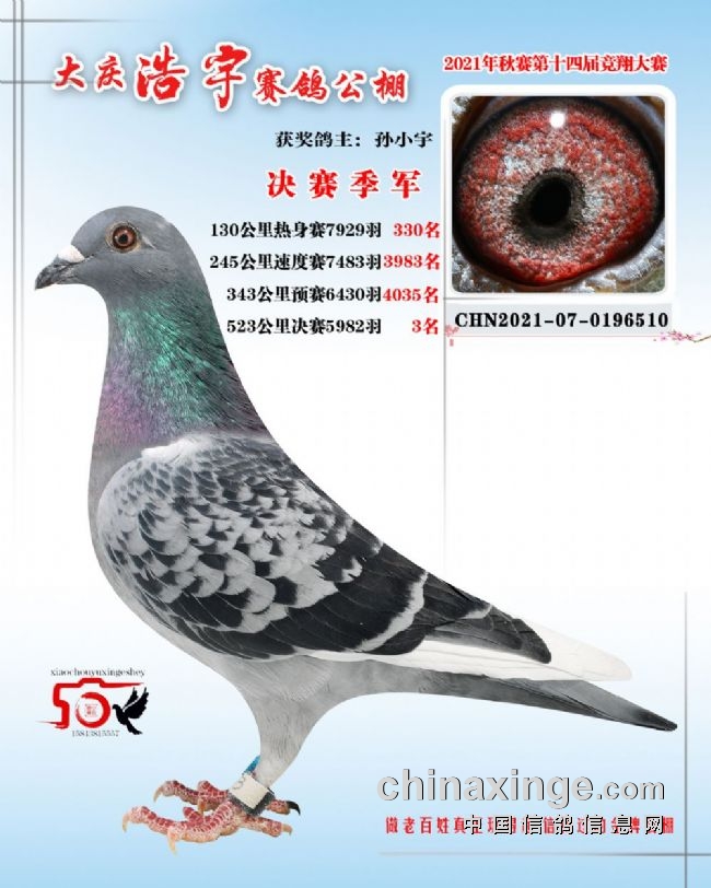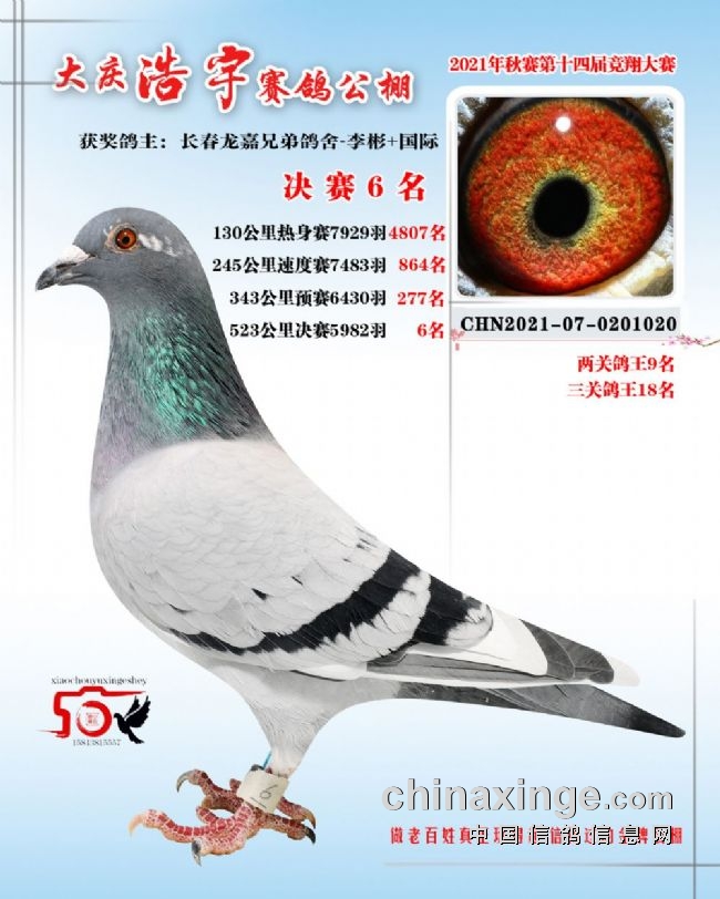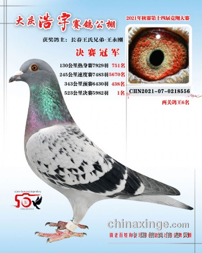 十四年的办赛经历,大庆浩宇深谙如何将比赛办好,让鸽友满意。黑龙江大庆浩宇赛鸽公棚2021年第十四届秋季公棚赛正式落下帷幕。回顾赛程勇闯西南赛线,一路所向披靡顺风顺水。热身赛就交出完美答卷,速度赛、预赛更进一步,飞出高分速。迎战决赛,最终由长春王氏兄弟-王永刚的一羽雨点鸽,环号为2021070218556,凭借着1599.5026米/分的高分速拿下决赛的冠军宝座。关兴勇的雨点鸽以1596.5222米/分的速度拿下亚军,孙小宇雨白条鸽紧随其后,以一秒之差获得季军。四关不尽兴,再上战场,一关加赛依旧亮眼,再加一关,胜利归巢!