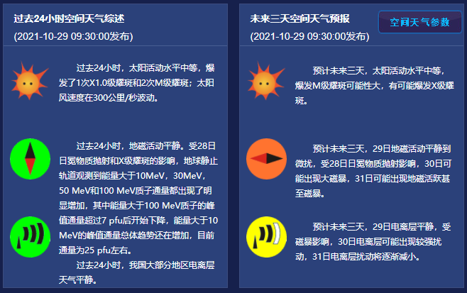 10月29日上午9点30分,中国天气网、国家空间天气监测预警中心发布的最新预报:预计未来三天,29日地磁活动平静到微扰,受28日日冕物质抛射影响,30日可能出现大磁暴,31日可能出现地磁活跃甚至磁暴。日冕物质抛射预计将于北京时间的30号到达地球,相应的在午后到夜间这段时间里制造地磁活动,强度等级有可能达到大地磁暴。