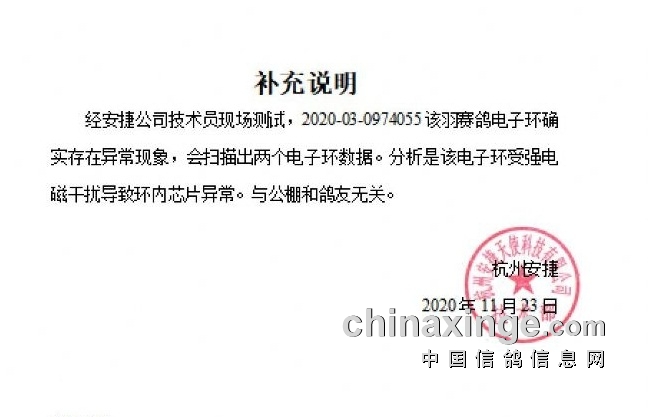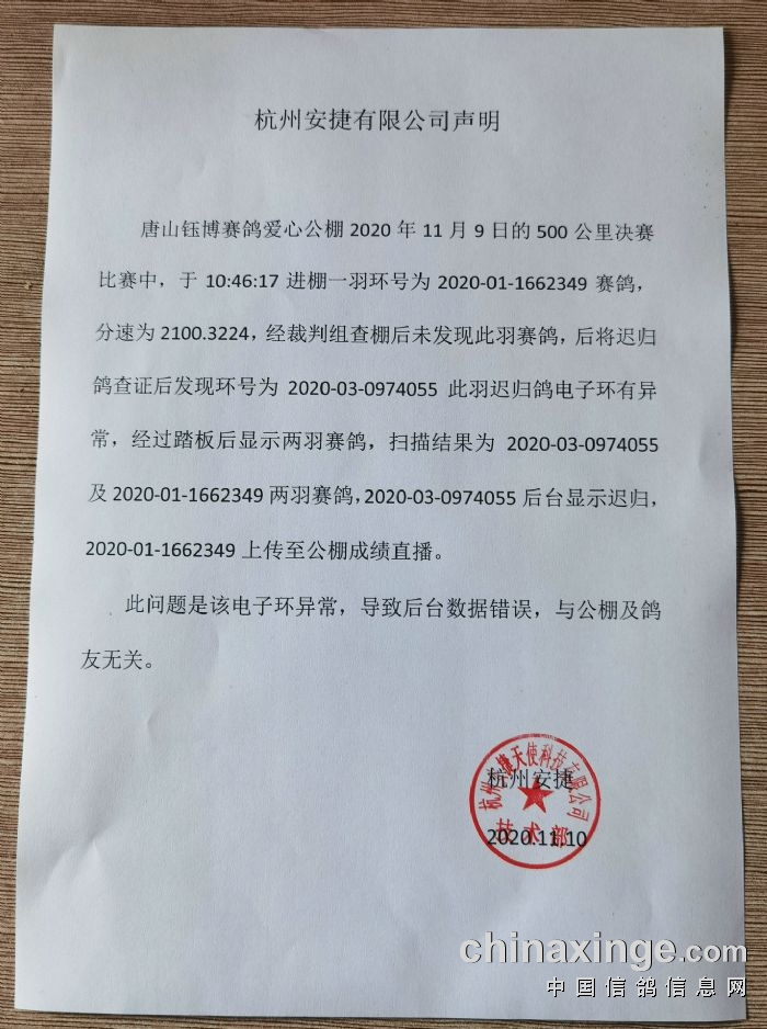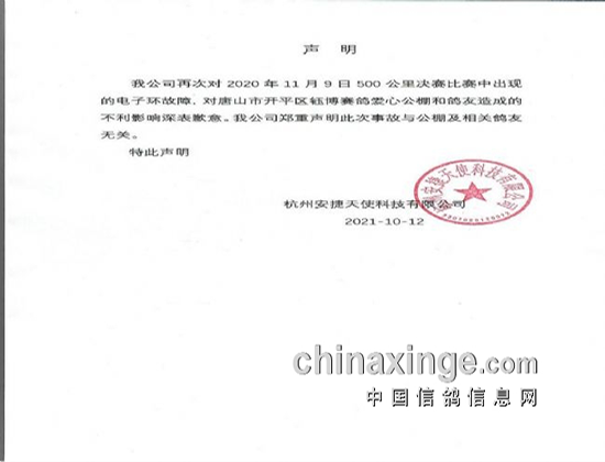 应唐山市开平区钰博赛鸽爱心公棚的要求,杭州安捷公司对2020年11月9日500公里决赛比赛中出现的电子环故障,对唐山市开平区钰博赛鸽爱心公棚和鸽友造成的不利影响深表歉意。杭州安捷公司声明此次事故与公棚及相关鸽友无关。