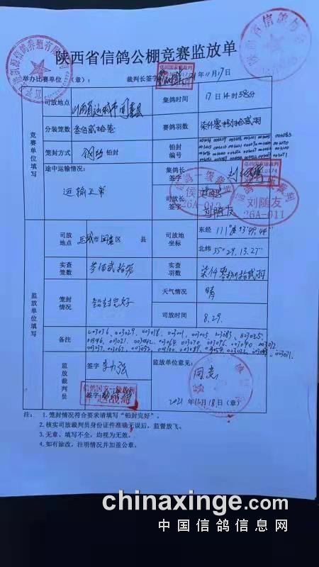 今天(11月18日),由陕西省信鸽协会监赛,中信网视频直播,鸽友参与监督,陕西威力青年公棚第一关比赛于早上08:29分在山西运城市闻喜县开笼,司放地经纬度:东经:111°13′49.44,北纬 35°29′13.27,实测空距为180.8公里,天气晴,鸽群走势良好。