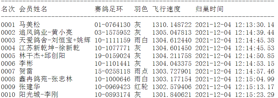 北京鸽友马美松环号01-0764130 灰鸽抢先一步,捷足先登,首先踏响鸽钟夺取冠军。归巢时间:12:13:30.14,分速为:1310.148米/分。