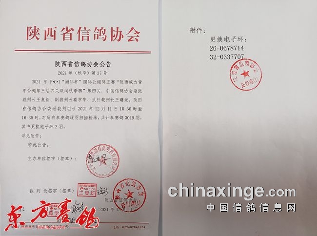 陕西省信鸽协会出示的集鸽报告。