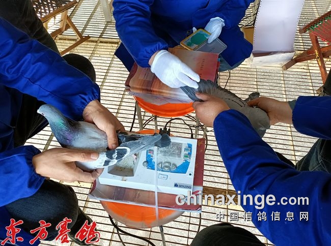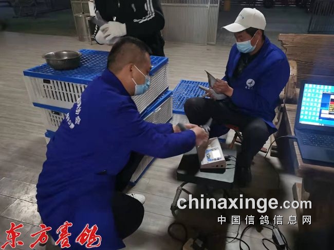 裁判员在扫描鸽子足环