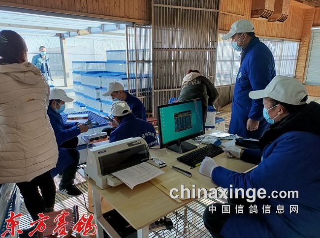 裁判员在观看鸽子录入电脑。