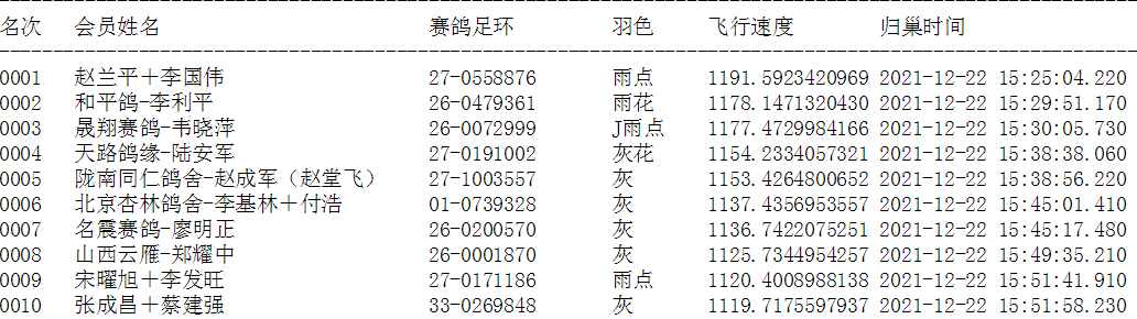 又讯:到12月23日17:30止,两天共归巢461羽,归巢率30.55%。