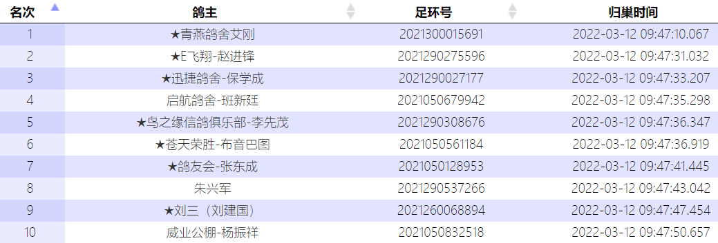 09:47:10.067,青燕鸽舍艾刚的2021300015691灰鸽首先入棚扫描,分速为1659.8218米/分,夺得冠军。飞翔-赵进锋的2021290275596获得亚军,迅捷鸽舍-保学成的2021290027177以2秒之差屈居季军。40秒内,前十名获奖鸽报到,当日归巢率为92.58%。截至13日12:30,已归巢7031羽,更多归巢数据敬请关注!