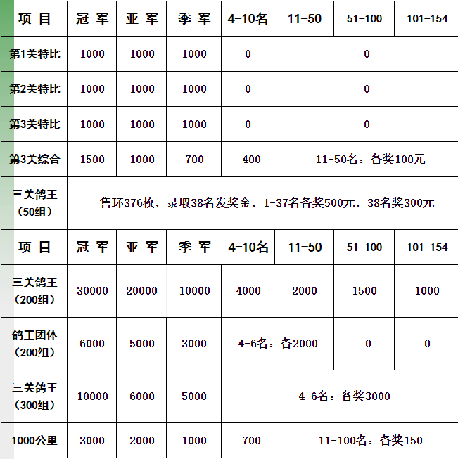 5、“铁鸽”三关特比环鸽王赛50元组、200元组、300元组:有鸽王资格的赛鸽,根据比赛系统三关总分速排名录取名次,200元组、300元组均不兼得50元组奖金。