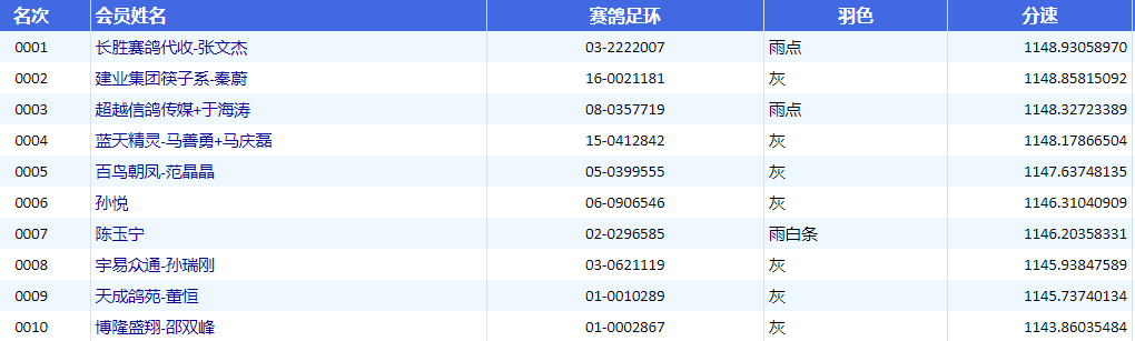 接近6小时后,第一梯度鸽群率先完成打钟,其中长胜赛鸽代收-张文杰环号03-2222007的雨点鸽夺得冠军,分速1148.93米/分。