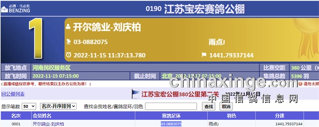 今天江苏宝宏赛鸽公棚第二关赛事于河南民权服务区如期放飞,一直以来南线赛事都以艰难飞行为鸽友熟知,今日在空距380公里宝宏的第二关赛事中,开尔小将03-0882075以1441.79米/分拔得头筹,勇夺冠军!