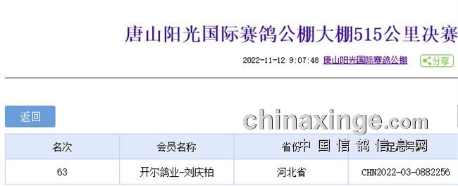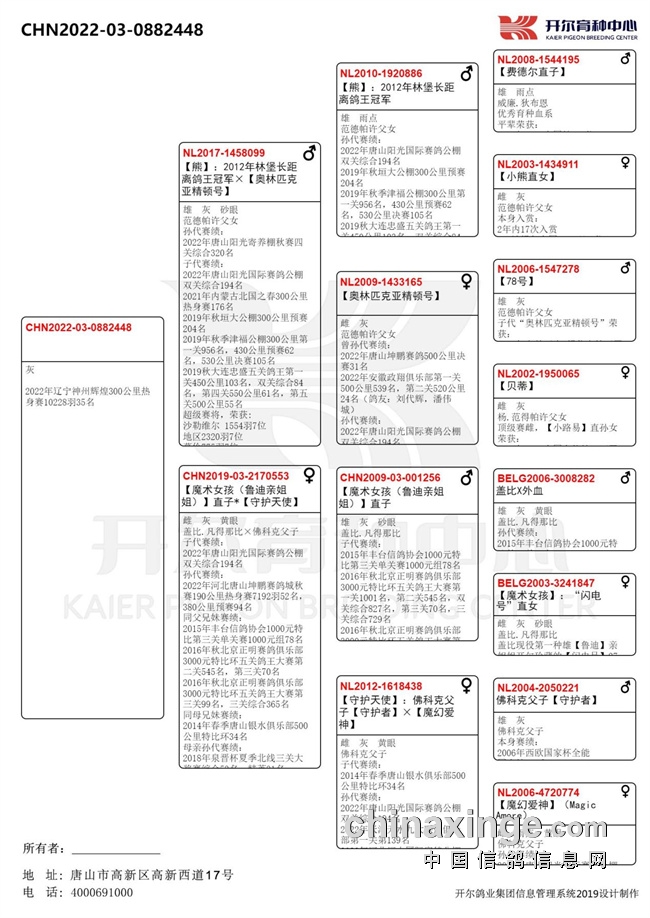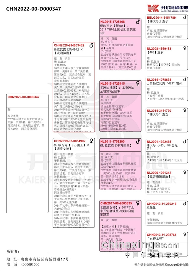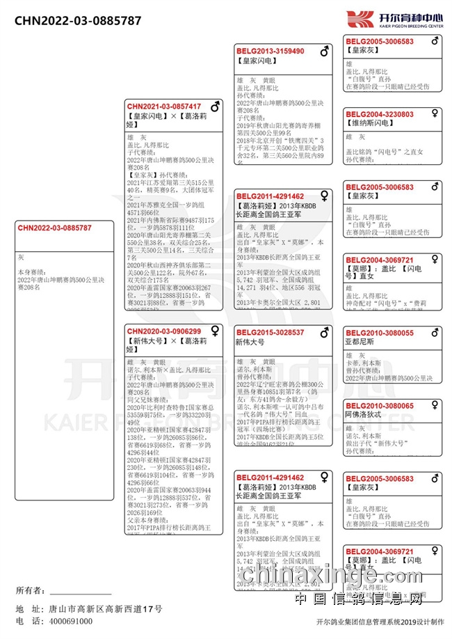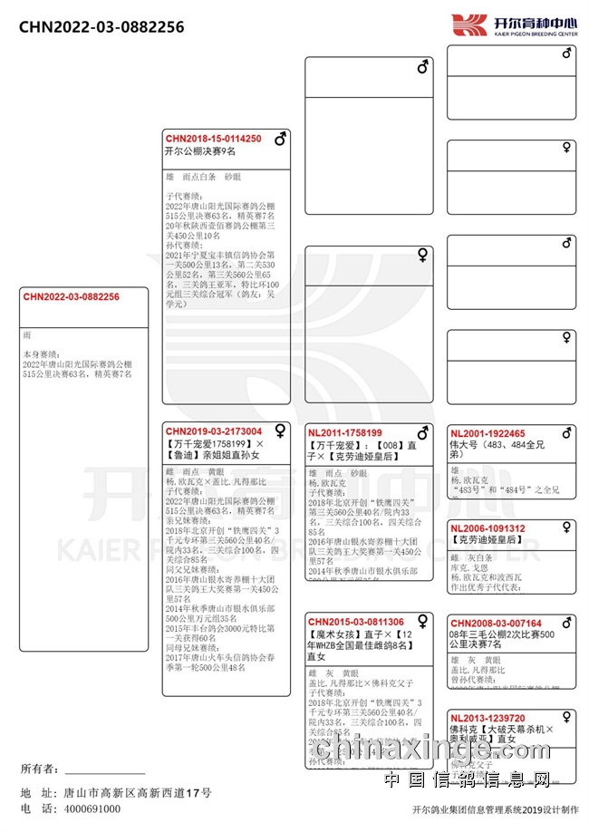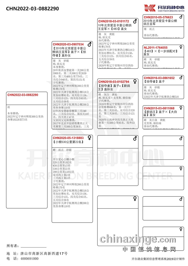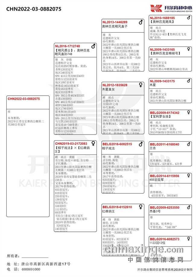 11月10日,开尔获得唐山阳光国际赛鸽公棚决赛515公里63名,精英赛第7名,环号为0882256,出自开尔杨·欧瓦克和盖比·凡得那比两大铭系!