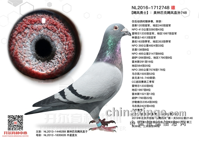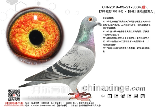 母亲是杨·欧瓦克【千万国王】× 【速度女神】,【速度女神】曾获得2017年北京开创者铁鹰四关综合鸽王冠军。