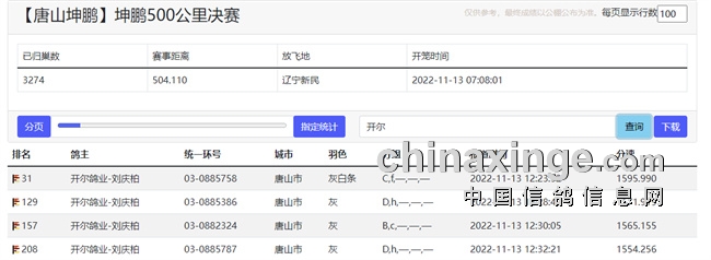 近期唐山坤鹏也在周日吹响了决赛的号角,开尔获得唐山坤鹏赛鸽500公里决赛31名-129名-157名-208名。
