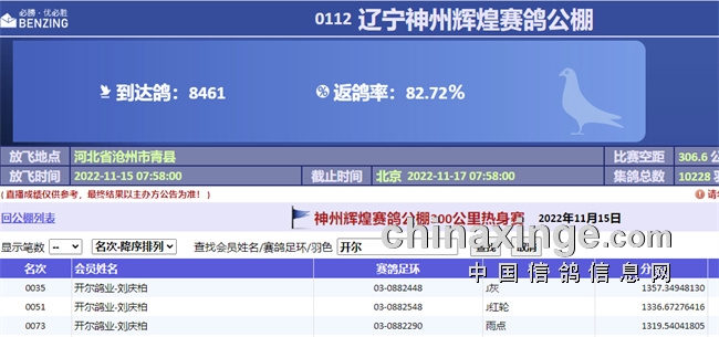 今日辽宁神州辉煌赛鸽公棚300公里热身赛也如期打响,开尔小将连获高位,获得10228羽35名、51名、73名。