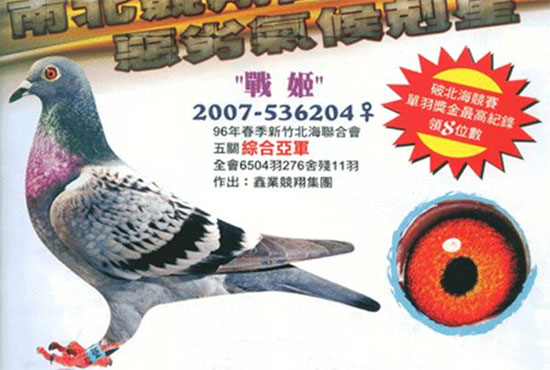 而05年鑫业集团继成为<<赛鸽风云>>纪实录中最大赢家后(一举打破大盈轮全船30449羽有史以来综合入赏最高纪录,获得大盈轮全船五关综合冠军、殿军、十位、十二位。)07年鑫业竟翔集团的“战姬号”,又再一次把台湾的历年纪录史推向高潮,以总组头打破北海竟翔单羽奖金最高纪录, 获新竹北海联合分会五关综合亚军, 全会6504羽残11羽(本舍仅挂6羽),领4400万大k!