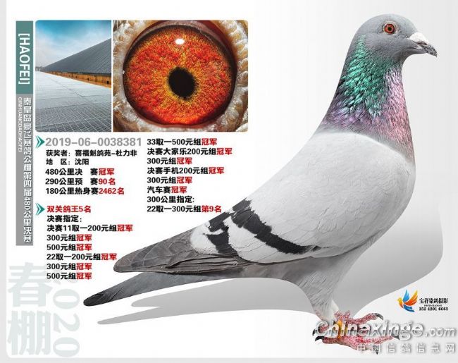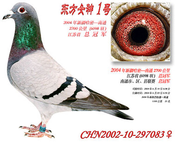答案揭晓:第三羽东方女神1号是超远程冠军鸽,它是2004年哈密-南通2700公里江苏省总冠军,南通市、区、县联赛总冠军。第一羽是2020年成都市千公里联赛冠军;第二羽是2012年KBDB全国长距离鸽王冠军;第四羽是2020年山东翔宇春棚千公里加站赛冠军;第五羽是秦皇岛豪飞赛鸽480公里决赛冠军;第六羽是2015年上海南汇四会联赛600公里总冠军。