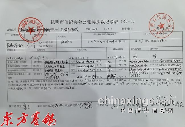 昆明市信鸽协会对集鸽和归巢执裁情况记录表。