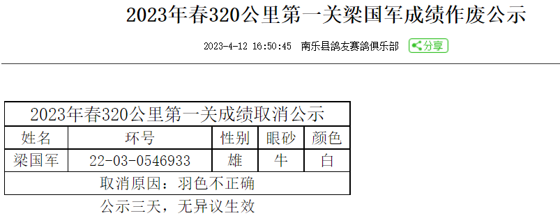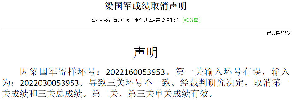 4月27日,南乐县鸽友赛鸽俱乐部发布声明称,鸽友梁国军因第一关输入环号有误,输入环号为2022030053953,正确环号为2022160053953。导致三关环号不一致,遂被取消第一关成绩和三关总成绩,第二关、第三关单关成绩有效。