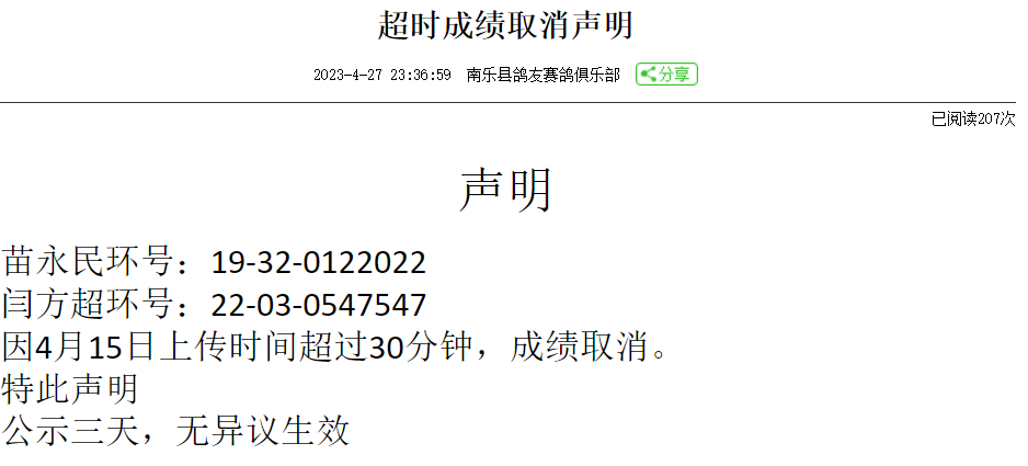 此外,俱乐部在27日当天同时发布了另一声明,两位鸽友在4月15日第二关比赛中,上传时间超过30分钟,成绩被取消。