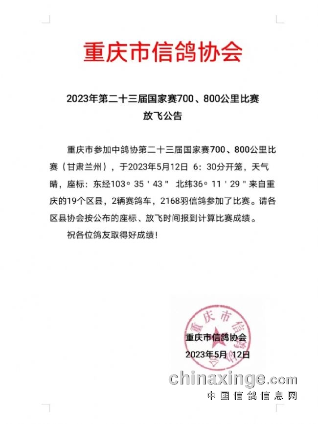最新消息:重庆市700、800公里长距离国家赛,已于5月12日早上6点30分,在甘肃兰州开笼放飞,放飞地坐标:东经103°35′43″、北纬36°11′29″,共计2168羽赛鸽。