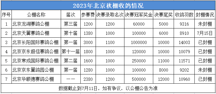 7月已至,各地收鸽已进入尾声,多家公棚宣布封棚。根据中信网数据显示,北京共有12家公棚,其中秋棚11家,其中7家可查询到收鸽数据,由此可见北京秋棚担当重要地位,引领北京赛鸽运动蓬勃发展。