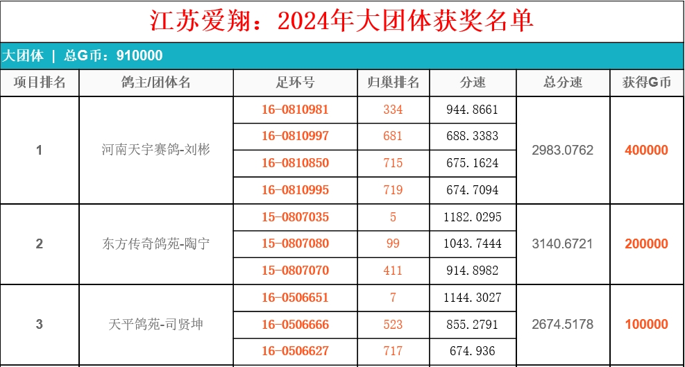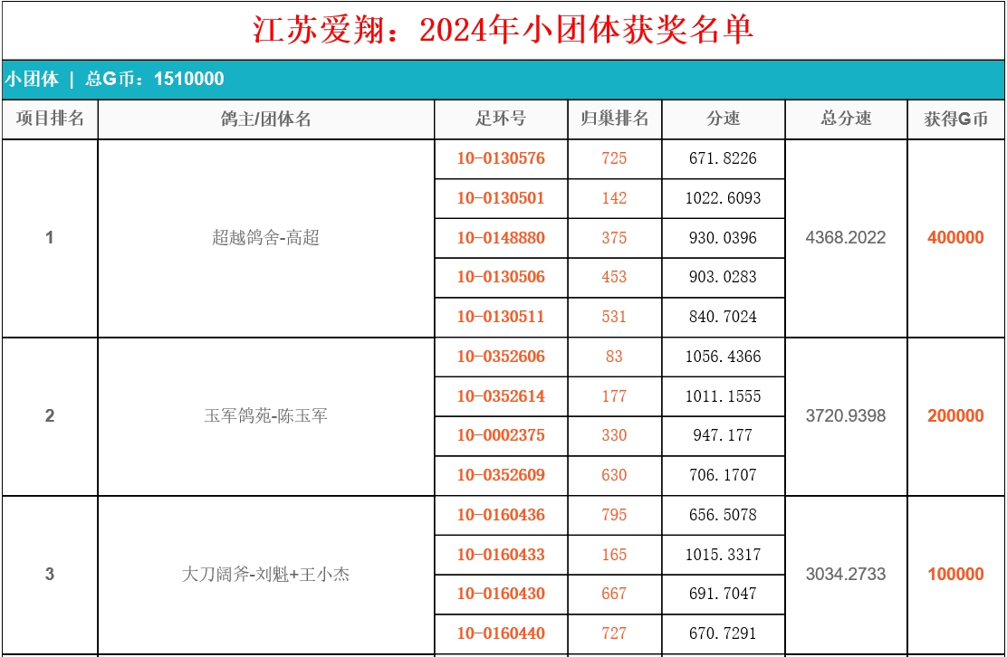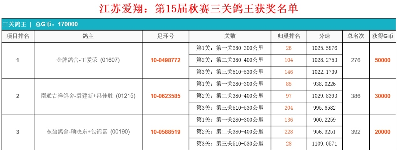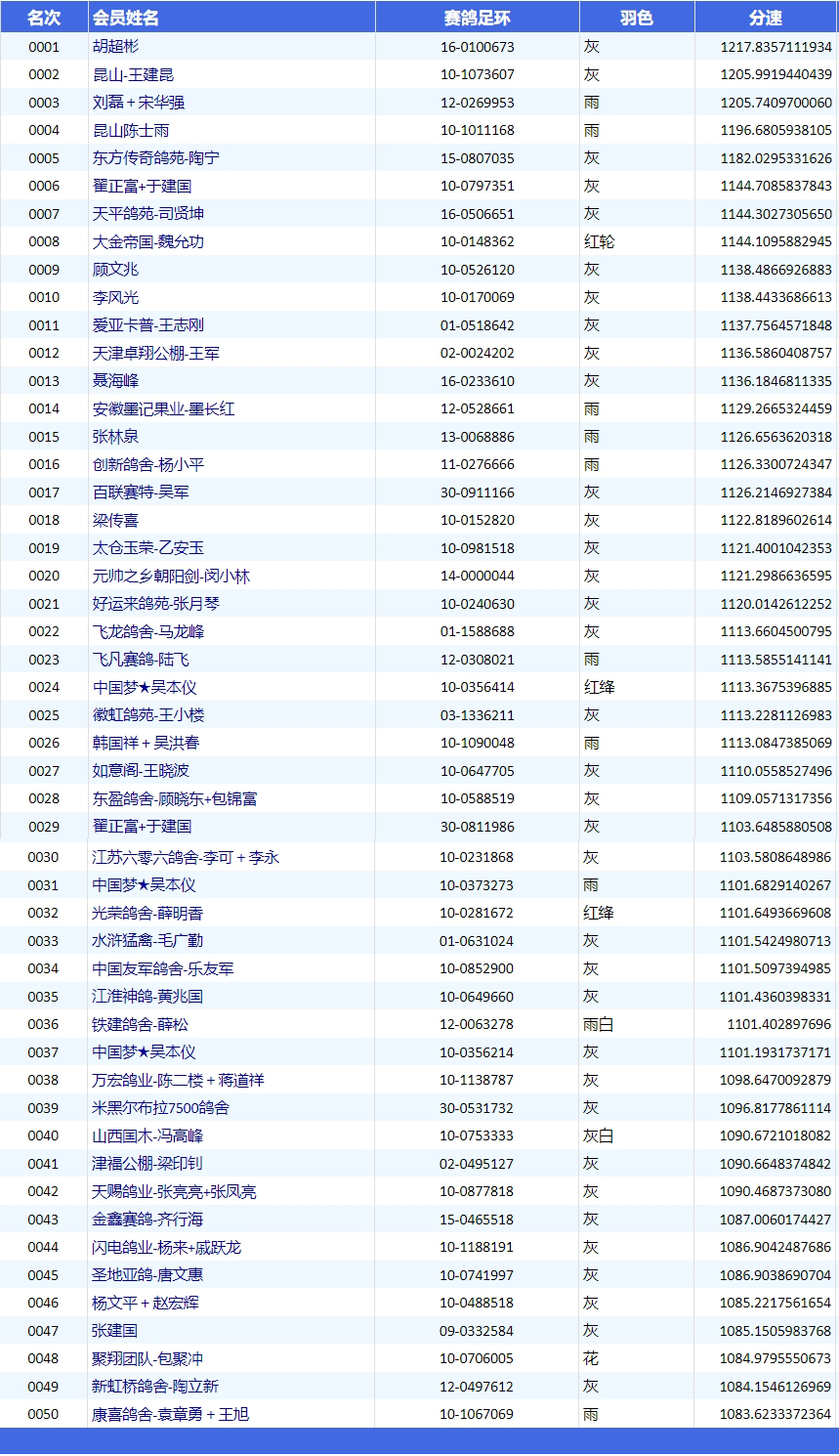 亚军:环号10-1073607,来自昆山-王建昆,分速1205.991米/分,同时也是精英赛冠军、小团体15名之首。