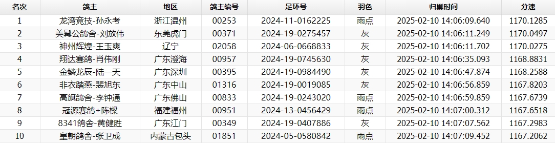 首羽归巢鸽在14:06开始打钟,是浙江名家龙湾竞技-孙永考,环号2024-11-0162225雨点,分速1170.1285米/分。亚军美髯公鸽舍-刘放伟,环号2024-19-0275457灰,分速1170.0497米/分;季军神州辉煌-王玉爽,环号2024-06-0668833灰,分速1170.0275米/分。看来前三名竞争激烈,已经是名家们的必争之地了。