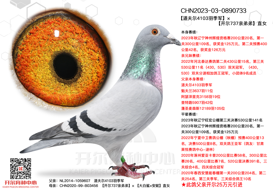 佛科克道夫尔季军字如其名,本身获得道夫尔4103羽季军,佛科克殿堂级种鸽亚特兰蒂斯的直子。眼睛如星空般深邃,独特的锯齿状内线口,都昭示着它非凡的血统与潜力。