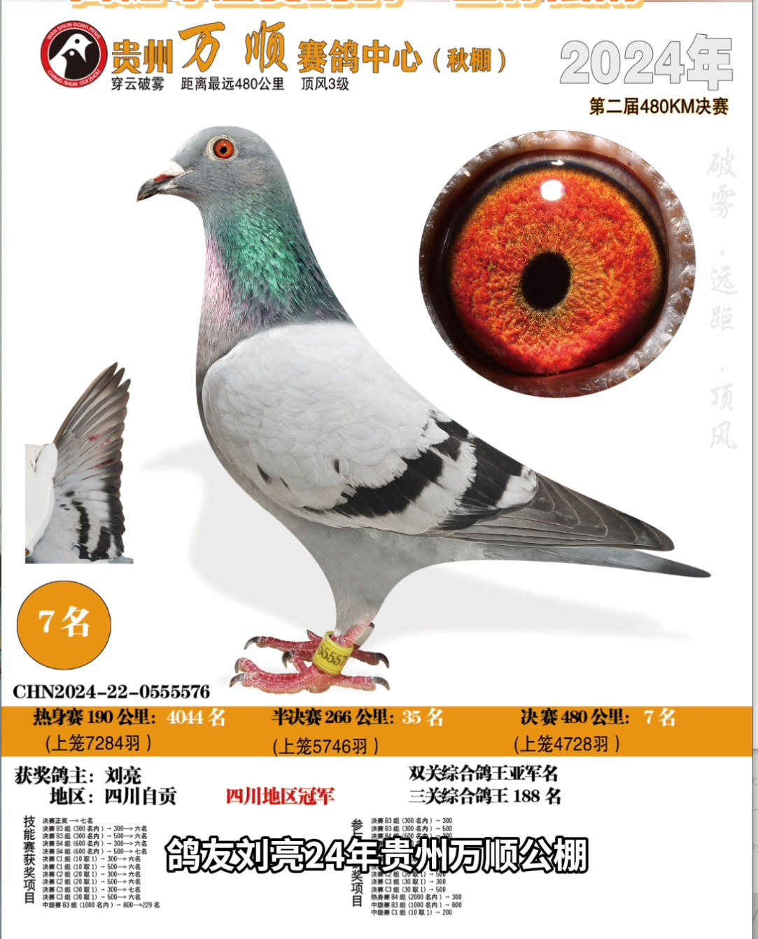 鸽友刘亮贵州万顺公棚半决赛266公里35名,决赛480公里7名,四川地区冠军