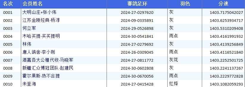 大明山庄+张小伟麾下战将2024-27-0297620灰,于13:01:43捷足先登摘取桂冠,分速1403.7175米/分;张小伟上笼两羽皆当日归巢,另一羽名列147名,成绩相当不错。