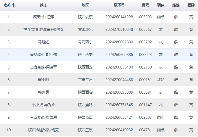 冠军:陕西安康鸽友成英银+汪涛麾下猛将2024260141228雨点于10:53:39踏向鸽钟摘取桂冠,分速高达1320.6807米/分。成英银+汪涛上笼4羽,均当日归来,厉害!