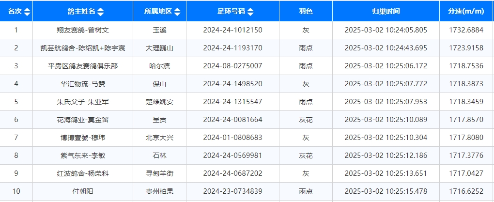 冠军:玉溪翔友赛鸽-曾树文麾下猛将2024-24-1012150灰于10:24:05踏向鸽钟摘取桂冠,分速高达1732.6884米/分。曾树文上笼一羽归巢一羽,且直接拿下冠军,厉害!