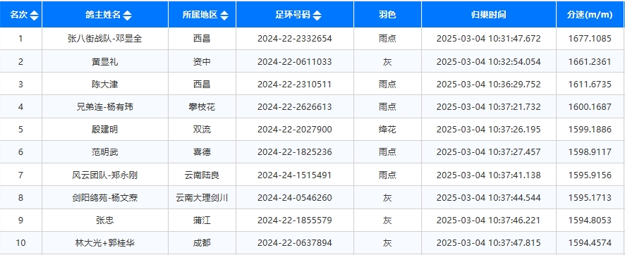 冠军:西昌鸽友张八街战队-邓显全名下的2024-22-2332654雨点,在10:31:47打钟,分速1677.1085米/分;邓显全共上笼5羽,截至11:36共归巢2羽。