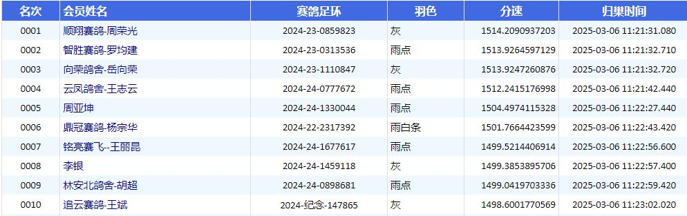 11点21分31秒,首羽顺利归来。顺翔赛鸽-周荣光的2024-23-0859823灰鸽领先一秒入棚,以1514.2090米/分的速度夺得魁首。紧接着,亚军和季军展开毫秒之争!最后智胜赛鸽-罗均建的2024-23-0313536雨点拿下亚军,分速为1513.9264米/分。季军则由向荣鸽舍-岳向荣的2024-23-1110847灰鸽获得,分速为1513.9247米/分。前三甲争夺战,可谓是精彩纷呈!