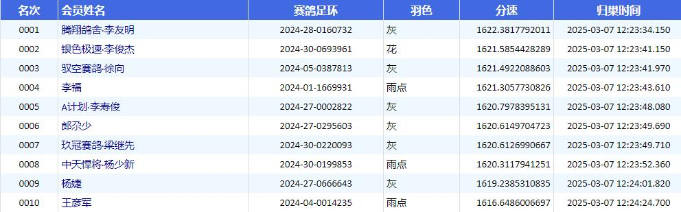 12点23分34秒,冠军诞生了。来自腾翔鸽舍·李友明的2024-28-0160732 灰鸽以1622.3817米/分的分速夺得冠军。七秒后,亚军、季军几乎同时进棚!仅毫秒之差,新疆伊宁的鸽友银色极速·李俊杰的2024-30-0693961花鸽拿下亚军,分速为1621.5854米/分。驭空赛鸽·徐向的2024-05-0387813灰鸽紧随其后取得季军,分速为1621.4922米/分。截至13点51分,已有3400多羽归巢报道,其余还在陆续返回中。