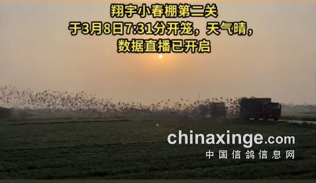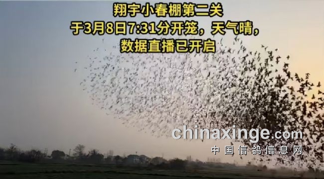 7点31分,山东翔宇春棚(小棚)380-430公里第二关于安徽舒城县开笼,共计放飞9646羽,实际空距400公里。据天气预报显示:本关比赛开笼后由侧顺风转变为顺风,风力大小2-3级。沿途天气多云,平均温度2℃-11℃,预计参考分速1400米/分或更高。今年是山东翔宇春棚(小棚)的首届春赛,监赛单位为临沂市信鸽协会。本届比赛收参赛费1999元/羽,总奖金1299.4万元,开奖羽数6500羽。