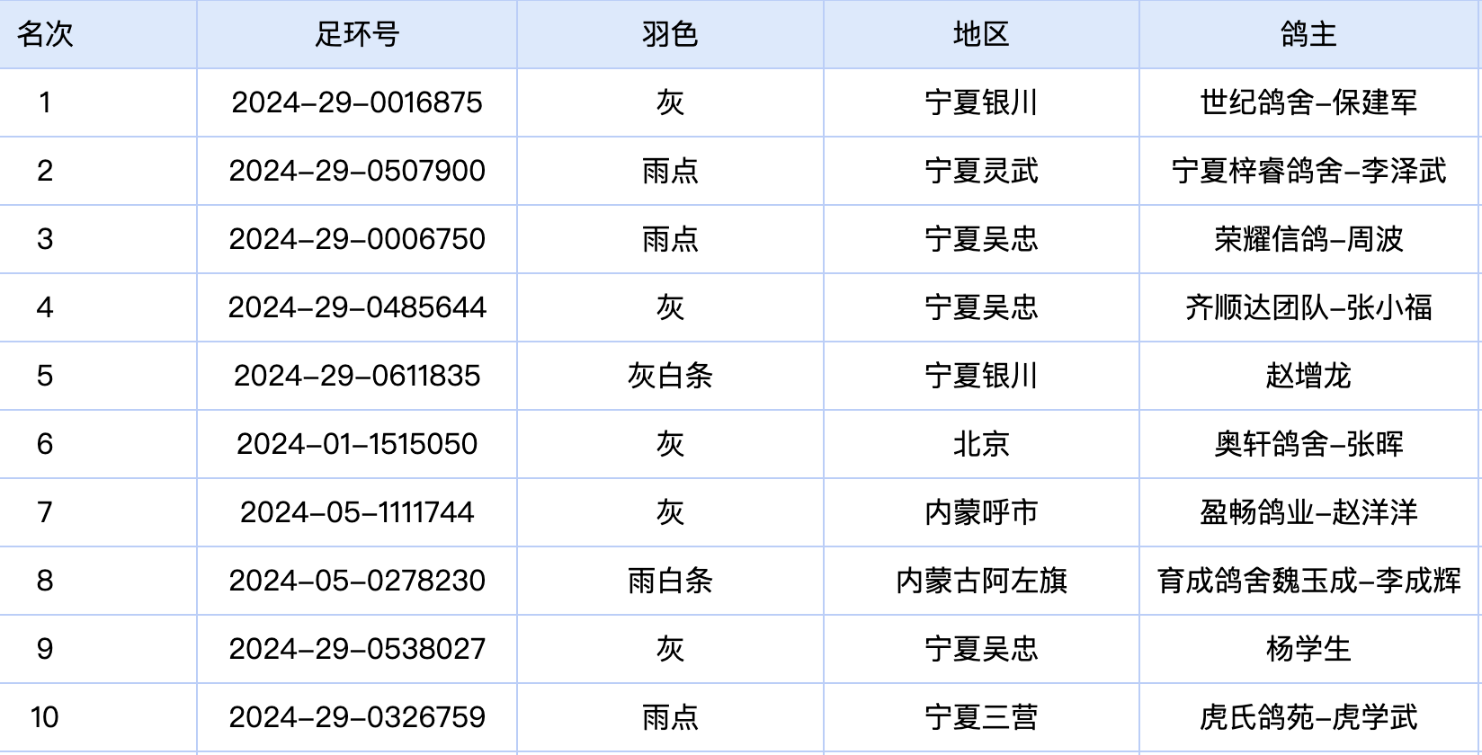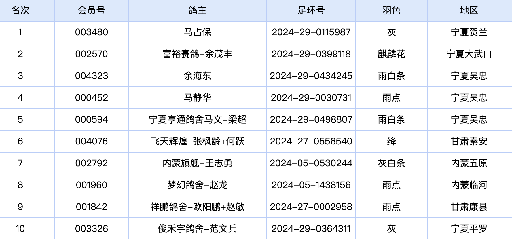 冠军是来自宁夏银川的鸽友,世纪鸽舍保健军名下的2024290016875分速1757.0327米/分;亚军是宁夏灵武的鸽友宁夏梓睿鸽舍–李泽武的环号2024290507900;季军是荣耀信鸽–周波名下的202429000。截至当晚九点半,已有万羽赛鸽归巢,归巢率达到93%。