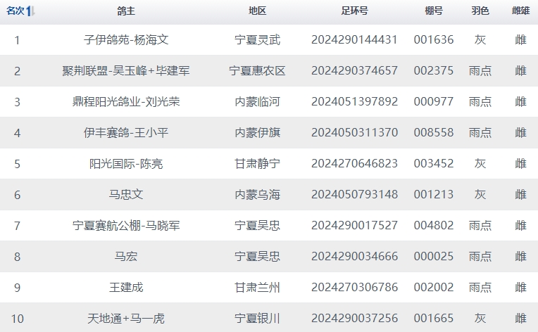 宁夏灵武鸽友的子伊鸽苑-杨海文2024290144431灰雌,飞行分速1346.5274米/分,获得冠军;聚荆联盟-吴玉峰+毕建军的2024290374657,飞行分速1343.7506米/分,获得亚军;鼎程阳光鸽业-刘光荣的2024051397892,飞行分速1343.3258米/分,获得季军。