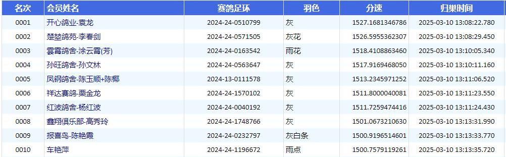 下午13点8分22秒见鸽,开心鸽业-袁龙2024-24-0510799的灰鸽率先打钟进棚,以1527.1681米/分的分速夺得魁首。七秒后,楚堃鸽苑-李春剑的2024-24-0571505灰花获得亚军,分速为1526.5955米/分。不到两分钟,雲霄鸽舍-涂云霄(芳)的2024-24-0163542雨花拿下季军,分速为1518.4108米/分。