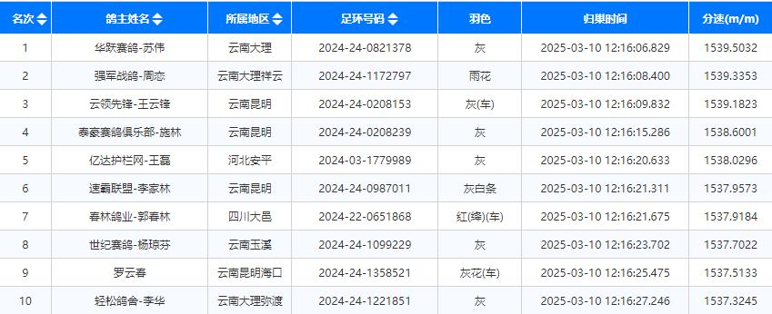 12点16分见鸽,同一分钟内进棚14羽,21分钟后正奖500名录取完毕。华跃赛鸽-苏伟的2024-24-0821378灰鸽以1539.5032米/分的分速夺得第一。两秒后,强军战鸽-周恋的2024-24-1172797雨花获得第二名,分速1539.3353米/分。一秒后,云领先锋-王云锋的2024-24-0208153灰鸽拿下第三名,分速1539.1823米/分。截至14点40分,已有3400多羽小将顺利返巢,归巢率接近半成。