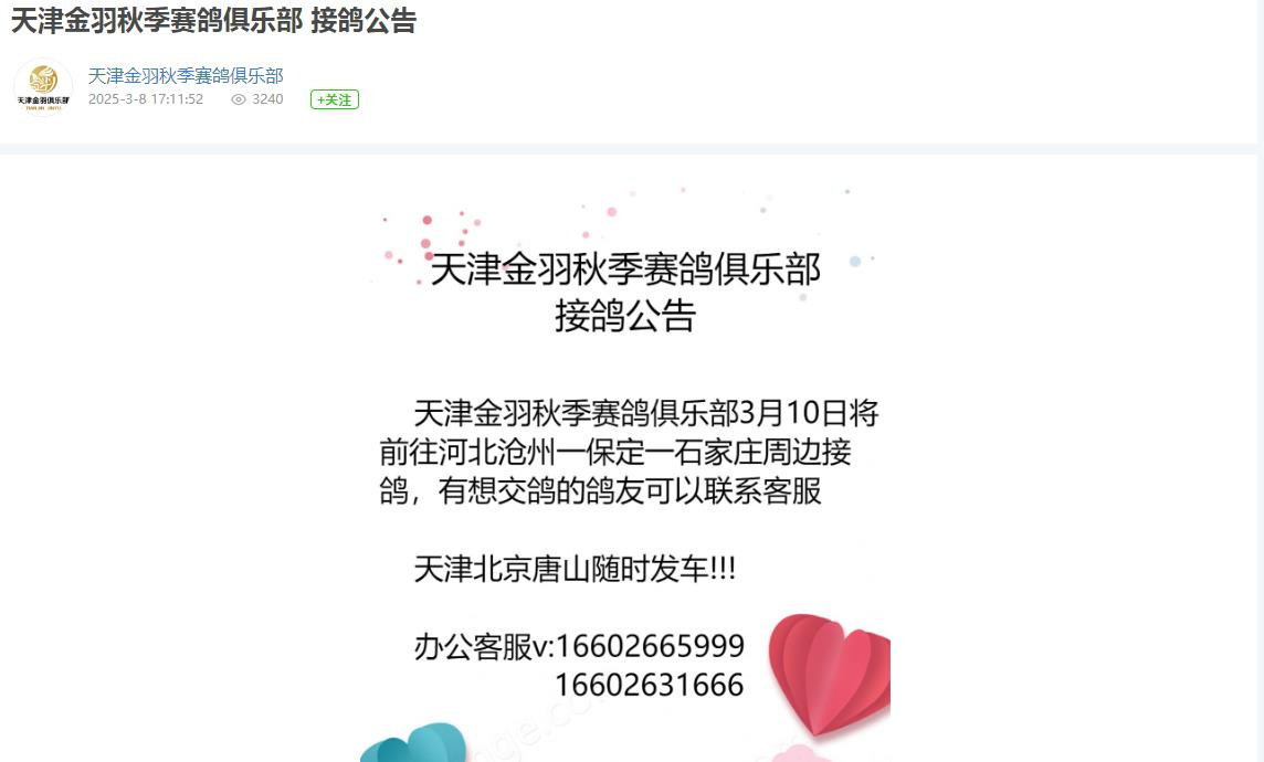 3月8日,天津金羽秋季赛鸽俱乐部在官网发布公告,将于3月10日正式开始接鸽,前往河北沧州一保定一石家庄周边。据统计,当前已有239羽入棚照录入成功。
